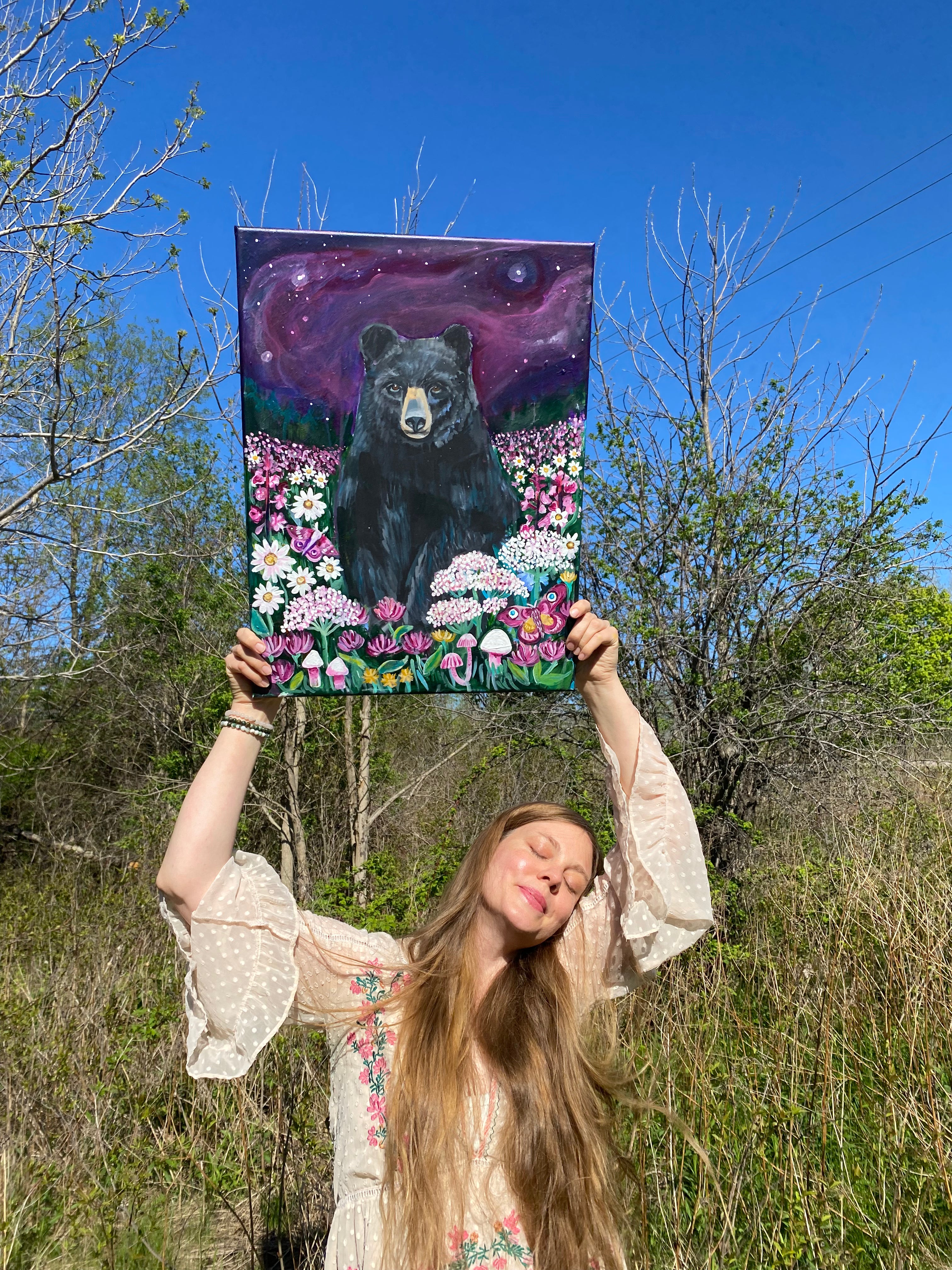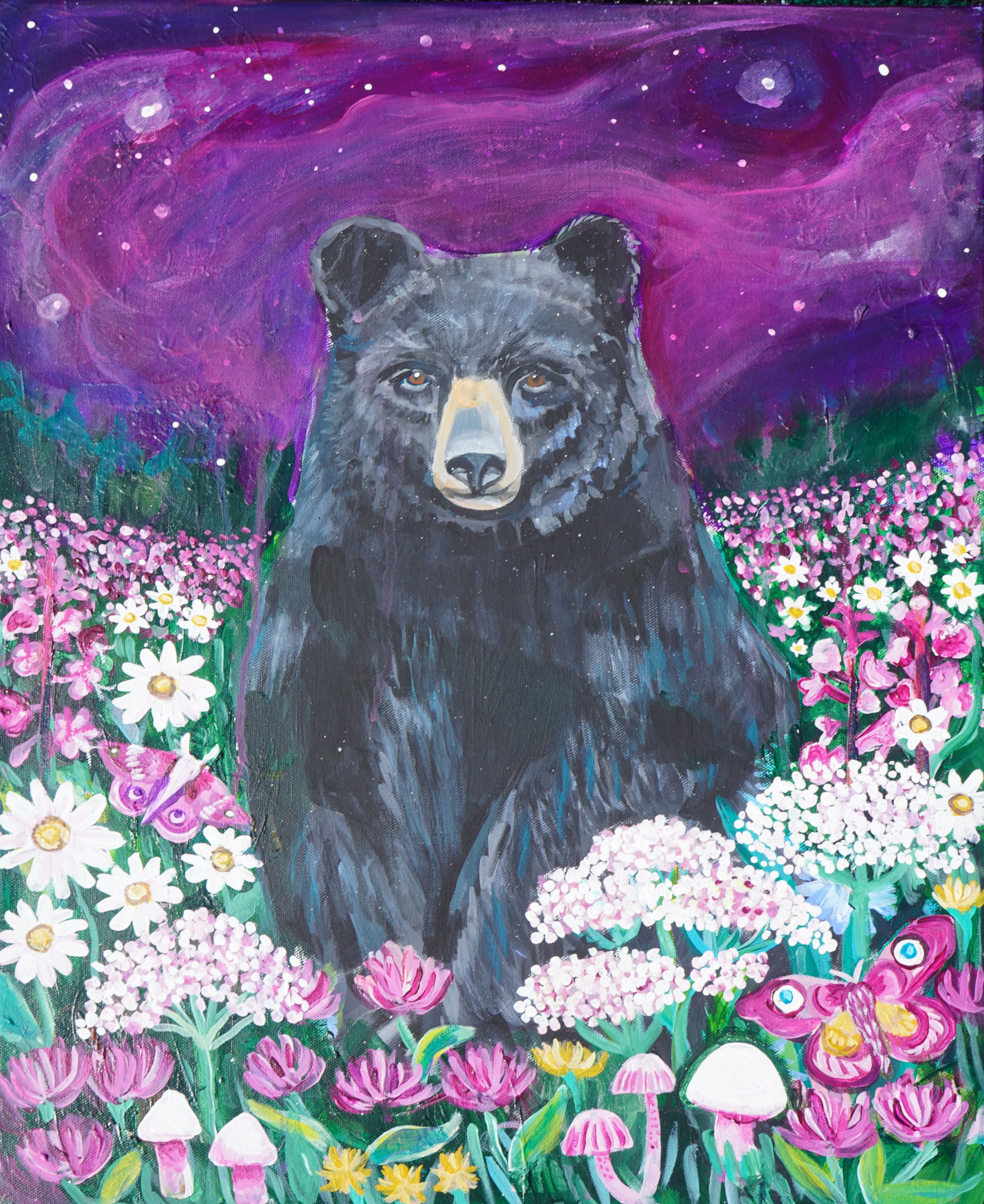 Original Acrylic Painting on Canvas16 x 20 inches,  Ready to Hang, 2025 In the abundant summer, under the infinite starry sky, a calm content landscape filled with wild flowers, butterflies and mushrooms. Black bears symbolize courage, strength and protection. Rich in colour and texture, this piece invites you to linger...